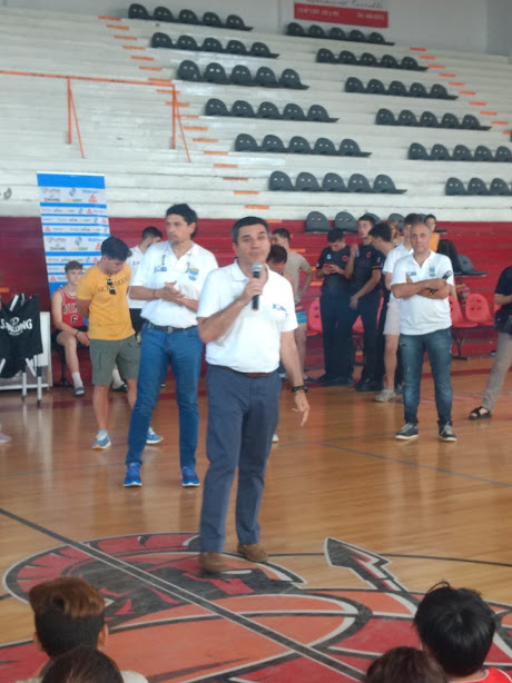 Luego se hizo cargo del micrófono Ángel “Pichi” Cerisola, quien dirigió unas palabras de agradecimiento a los colegios por seguir con el proyecto, a sus compañeros y a los que le dieron color a la fiesta. Agregó: “año tras año vamos mejorando en la organización, se suma más gente, más escuelas, más padres, más diversión, porque se trata de eso”. Al igual que Oscar, reconoció que, si no es básquet, que sigan practicando algún deporte porque hace bien. Invitó a dos integrantes de la banda “Los Totora”, Santiago y Juan Ignacio Giorgetti. Ellos dos junto a Oscar y Cerisola, llamaron a dos chicos y una chica para darle un calzado. Entre la Asociación y la Subsecretaria de Deportes de la provincia, consiguieron zapatillas para 43 jóvenes elegidos como mejores compañeros por sus propios pares.